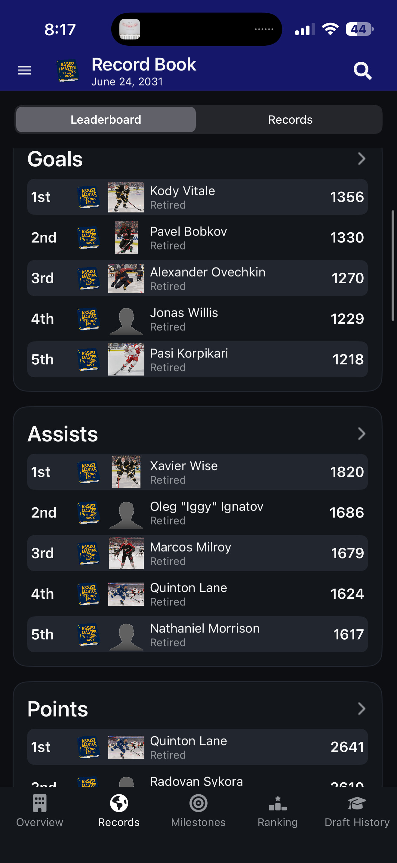 Been working on a custom roster since October. Teams made up of end of franchise modes I finished in ea nhl and hlm over the years. Also has my personal record book of player records of every franchise mode I’ve had since nhl 17. Skaters records of players that played over 500 games for me and goalies over 150 is generally the rule of those with stats entered with a few exceptions.